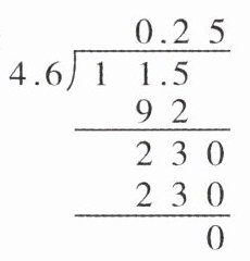 $\begin{array}{r}0.25 \\4.6\enclose{longdiv}{11.5} \\92 \\\hline230 \\230 \\\hline\end{array}$