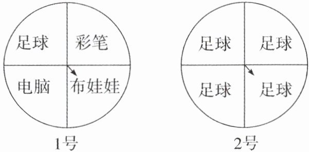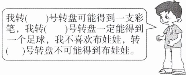我转( )号转盘可能得到一支彩笔,我转( )号转盘一定能得到一个足球,我不喜欢布娃娃,转( )号转盘不可能得到布娃娃。