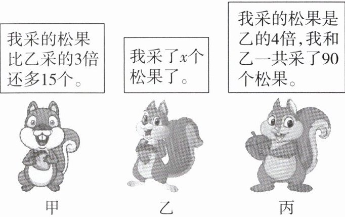 由题意知,丙采了4x个松果,甲采了(3x+15)个松果。