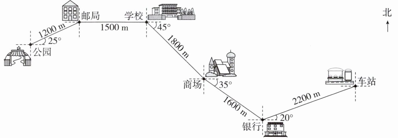 (1)小丽家在广场北偏西$20^{\circ}$方向$600\ m$处。