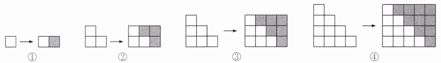 1. 用两组不同颜色的正方形拼接,构造如下所示的长方形来研究“$ 1 + 2 + 3 + 4 + 5 + 6 + 7 + 8 + \cdots $”的计算结果。