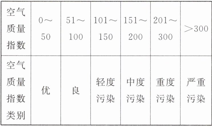 (填“优”“良”或“轻度污染”)。|空气质量指数|0~50|51~100|101~150|151~200|201~300|>300|
