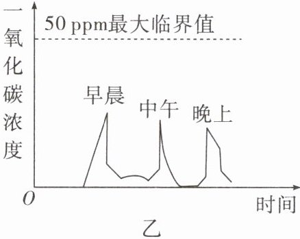 。(3)同学们利用微型空气质量“检测站”测得某小区地下车库中一氧化碳在不同时间段内的浓度如图乙(已知:50 ppm 为一氧化碳准许成年人置身其中的最大量)。由图乙观察一氧化碳浓度最大的时间段是