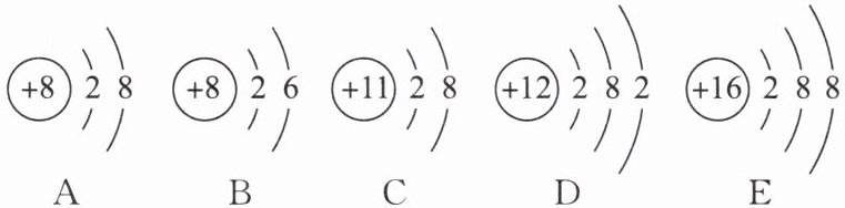 (1)A~E共有种元素,属于同种元素的是(填字母)。