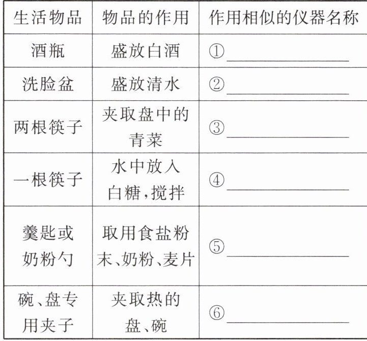 15. 生活中,有许多物品的使用与实验室中仪器的作用相似,请将作用相似的仪器名称填写在相应的位置。