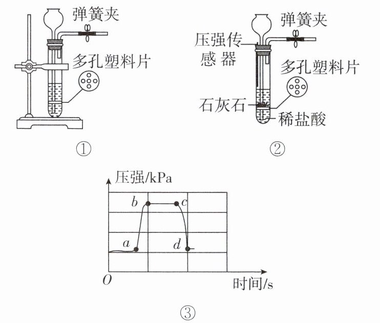 9. 图①是小组同学组装的实验室制取二氧化碳的发生装置,其优点是可控制反应的发生和停止,为了解装置具有此优点的原因,他们在装置中连接压强传感器(如图②),从而测定实验中试管内气体压强变化的情况(如图③),下列说法错误的是(