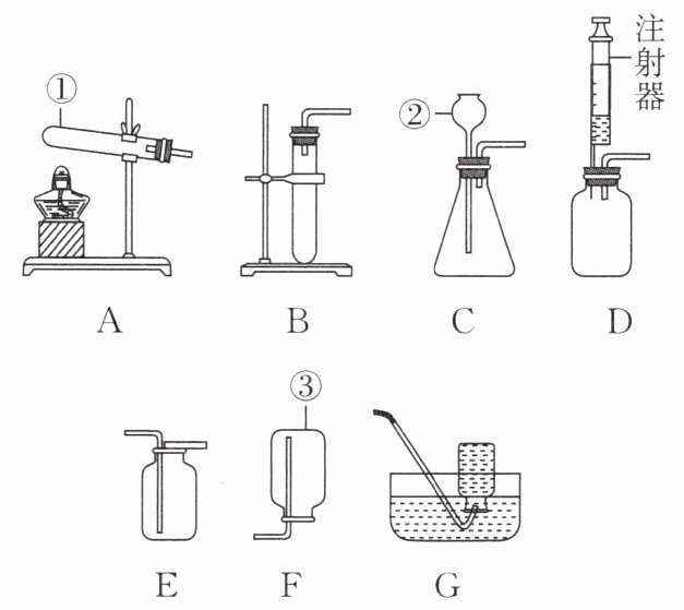 (2)A E(或$ G) 2KMnO₄\triangle=K₂MnO₄ + MnO₂ + O₂↑ (3)$可以控制氧气产生的快慢和量的多少$ 2H₂O₂\stackrel{MnO₂}{=}2H₂O + O₂↑$