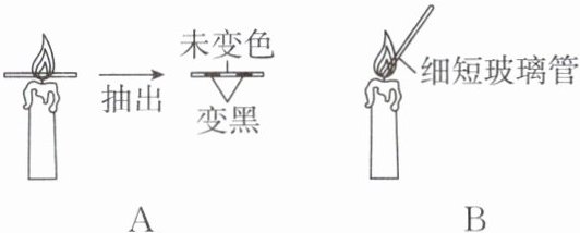(2)小李同学向焰心斜向插入一根细短玻璃管,观察到玻璃管中无明显现象(如图 B 所示),将燃着的木条接近玻璃管的上口,上口处产生火焰。焰心物质具有的性质是