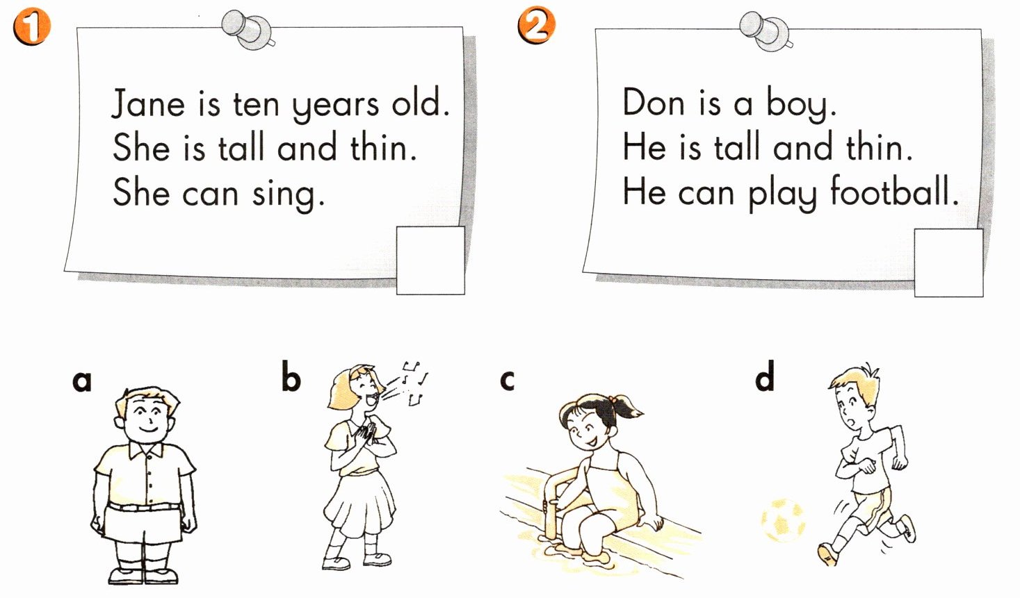 1. fat; play football 2. thin; sing 3. girl; can’t