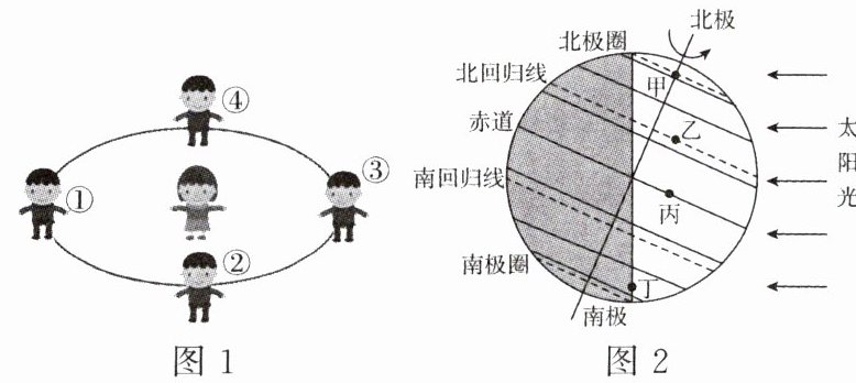 图 1 为两位同学演示地球公转运动图(女生代表太阳,男生代表地球,其伸展手臂代表赤道,头部代表赤道以北),图 2 为某日太阳光照示意图。读图 1 和图 2,完成 1~3 题。