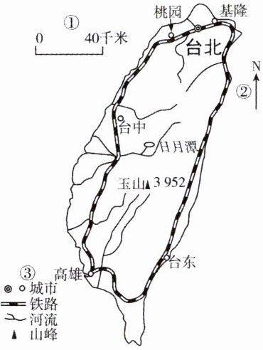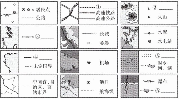 ①铁路 ②山峰 ③洲界 ④国界 ⑤沙漠 ⑥常年河、湖