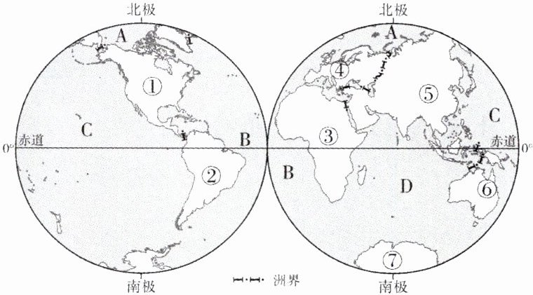 (4)跨经度最广的大洋是______(填字母),世界上最小的大洲是______(填数码)。