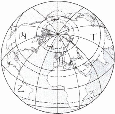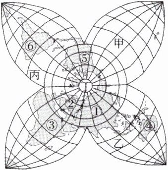 运用皮尔斯梅花投影法绘制的世界地图如图所示,图中数码代表大洲,甲、乙、丙、丁代表四大洋。读图,完成 6~7 题。
