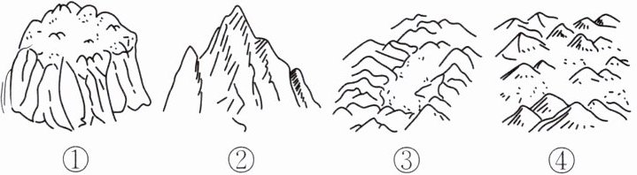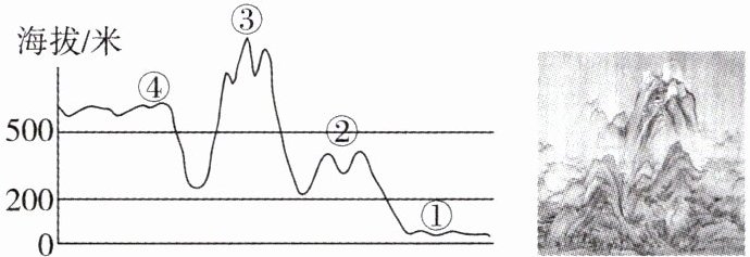 下图为四种地形类型的剖面示意图和北宋王希孟《千里江山图》(部分)。读图,完成 1~2 题。
