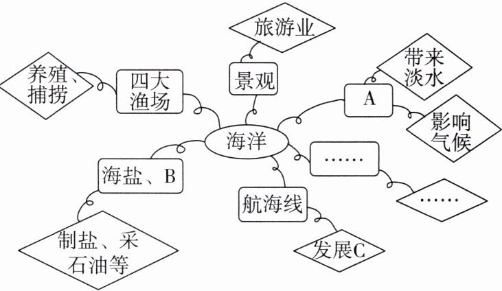 (4) 海洋具有互联互通的特点,全球洲际往来和贸易通过海洋运输完成;海洋也被沿海国家称为“资源的宝库”。将①海上运输、②降水、③矿产对应填入图中字母方框。A—______;B—______;C—______。