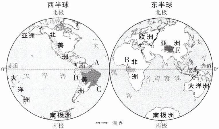 (2) 写出赤道穿过的地形区名称:A______平原,B______盆地。