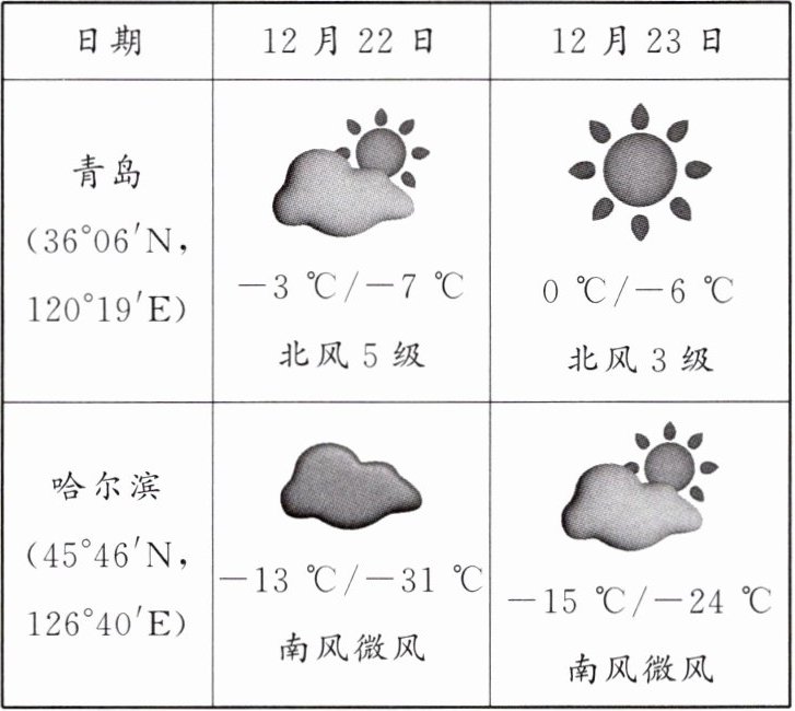 12. 雪堡银堆砌,冰雕玉作成。2024 年 12 月 23 日,黑龙江哈尔滨第三十七届太阳岛国际雪雕艺术博览会试开园。制作精美、巧夺天工的雪雕作品令游客们惊叹不已。下表示意青岛和哈尔滨部分时段天气预报。据此完成下列问题。