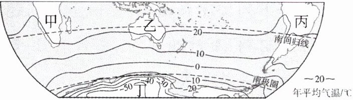 企鹅全身羽毛呈重叠、密接的鳞片状,不但海水难以浸透,就是气温在零下近百摄氏度,也难以攻破它保温的防线。读南半球年平均气温分布图,完成 6~7 题。
