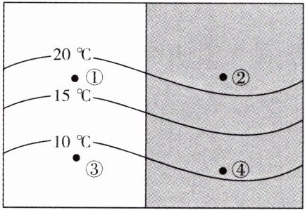 9. 图中①②③④四点气温比较,正确的是( )