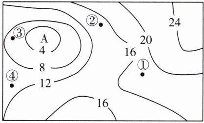 4. 等温线图上,A 地等温线呈闭合状态,且中间气温是最低的,表示这里( )