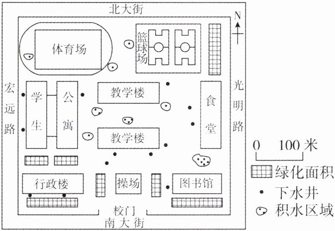 某中学校园内在连续较长时间降水或遇暴雨天气后,部分区域路面常会出现积水,给师生的学习生活带来不便。为解决这一问题,地理小组以“我的校园我的家”为主题,开展项目化学习。小组成员测量并绘制了校园平面图。某次较强降水后,同学们找到积水位置,并把积水明显的区域标记在图中相应位置。