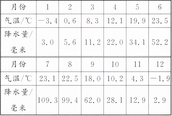 |气温/℃|-3.4|0.6|8.3|12.1|19.9|23.5|