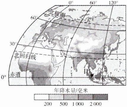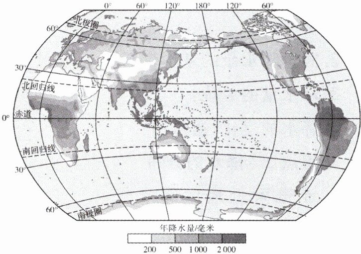 (2)根据图例的颜色和数值关系,可对比估测两地的年降水量多少。例如:赤道附近大部分地区年降水量在______毫米以上,降水______;南北极大部分地区年降水量在______毫米以下,降水______。