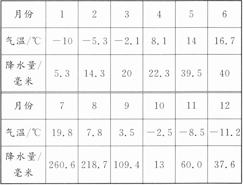 |气温/℃|-10|-5.3|-2.1|8.1|14|16.7|
