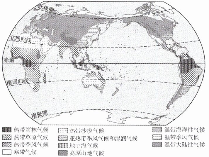 (1)同学们读图发现,南、北回归线之间主要分布有热带雨林气候、热带沙漠气候、______气候和热带草原气候四种热带气候类型,它们共同的特点是______,造成这种特点的主要影响因素是______。