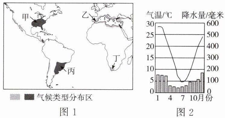 图1为世界局部地区两种气候类型分布图,图2为某地气温曲线和降水量柱状图。读图,完成12~13题。