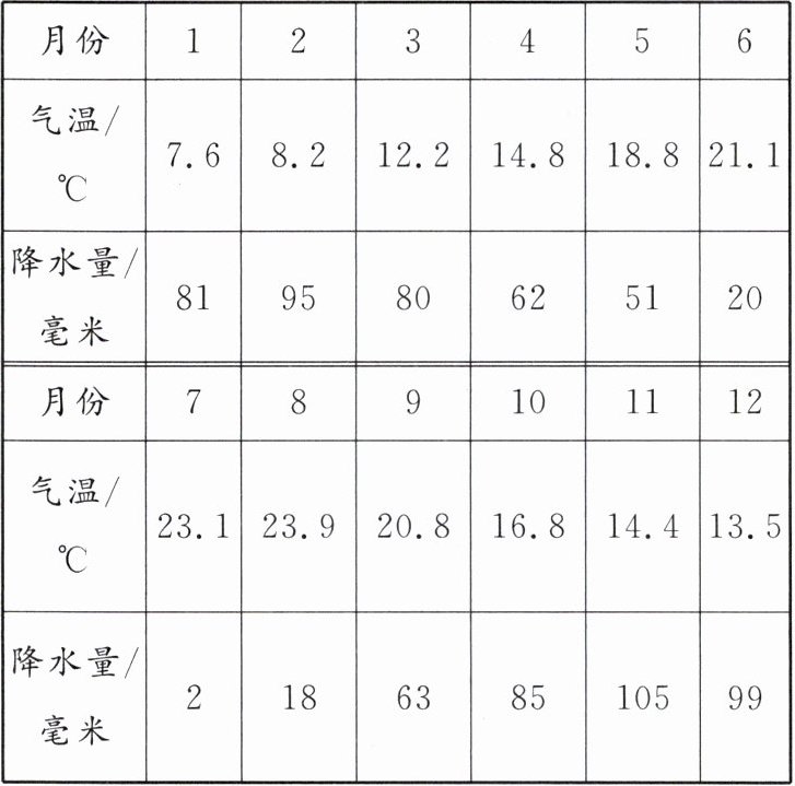 (5)小顺收集了意大利首都罗马多年平均气温和降水量数据(上表),请你判断罗马的气候类型是______。据表格数据信息,总结罗马6、7、8月份的气候特点:______。