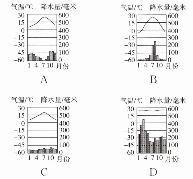 (3)下列四幅图中能反映我国首都北京的气候类型的是______(填字母),其气候特征是______。