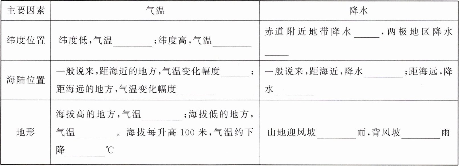 |纬度位置|纬度低,气温______;纬度高,气温______|赤道附近地带降水______,两极地区降水______|