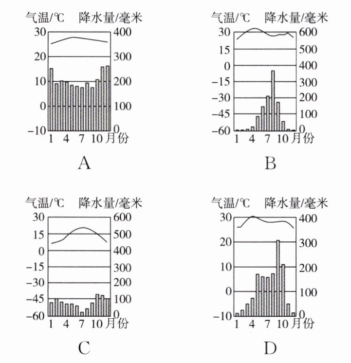 11. 下面气候资料图中,符合四城市中气温最高的城市的是( )