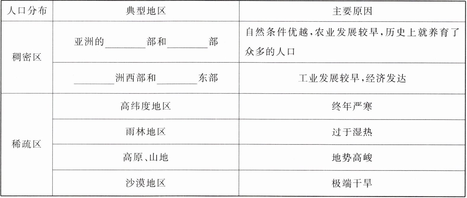 |稠密区|亚洲的______部和______部|自然条件优越,农业发展较早,历史上就养育了众多的人口|