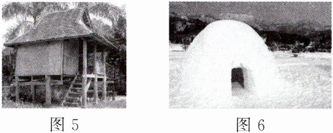 (5)气候对乡村的建筑影响明显。图 5、图 6 分别是东南亚地区的高脚屋和因纽特人居住的冰屋。高脚屋适应当地气候______的特点,冰屋主要适应当地气候______的特点。