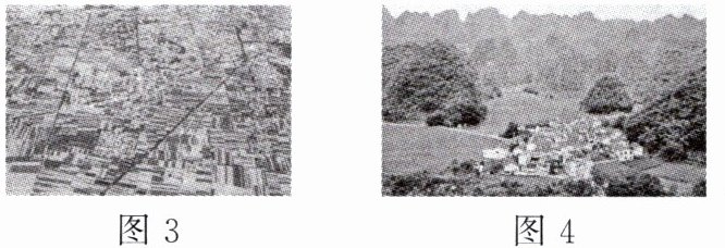(4)图 3、图 4 分别为我国华北平原、云贵高原部分地区乡村分布景观图。属于山地地区乡村分布的是图______,请从地形角度分析该地区很难形成大面积团块状乡村的原因:______。