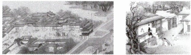 唐代著名诗人杜甫的《水槛遗心二首·其一》中有一句“城中十万户,此地两三家”描写了城镇与乡村不同的场景。下图分别为古代城镇与乡村景观图。据此完成 6~7 题。