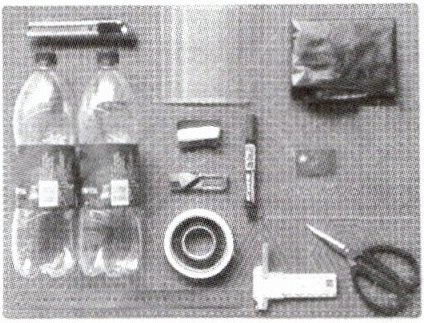制作材料:两个 2.5 升矿泉水瓶、尼龙绳、塑料袋、电工胶带、双面胶、马克笔、剪刀等。
