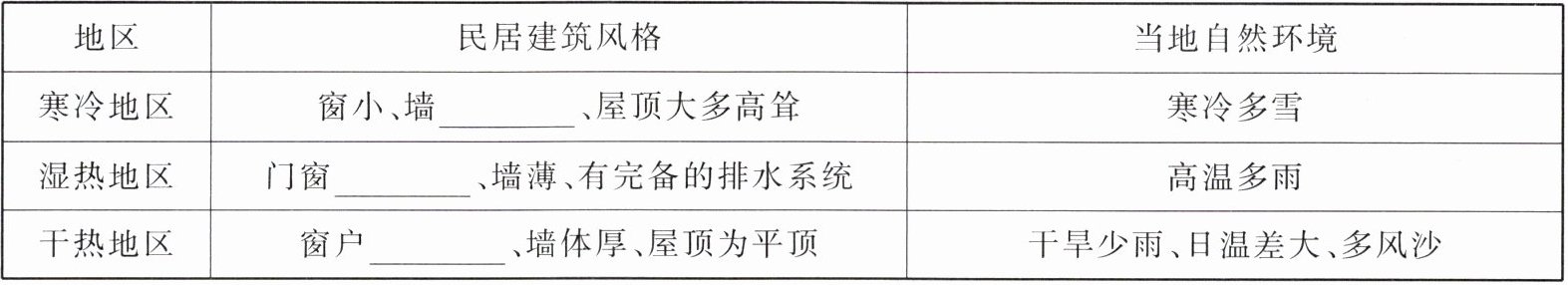 |寒冷地区|窗小、墙______、屋顶大多高耸|寒冷多雪|