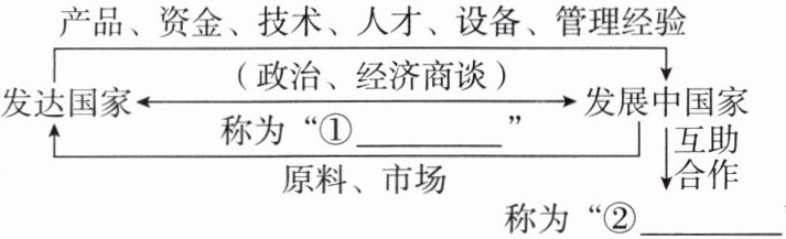 发达国家←→发展中国家(政治、经济商谈),发达国家提供产品、资金、技术、人才、设备、管理经验,发展中国家提供原料、市场。发达国家与发展中国家之间的政治、经济商谈称为“①____”,发展中国家之间的互助合作称为“②____”。