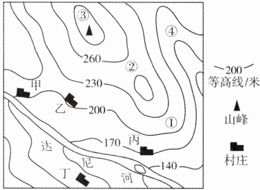 我的家乡在江南一个美丽的村庄,村庄坐落在小山坡下,背北向南而建,村前是清澈见底的达尼河,总是不知疲倦地流淌着。村前河中一片沙洲,是我和儿时伙伴经常嬉戏的地方……读村庄所在地区等高线地形图,完成 14~15 题。