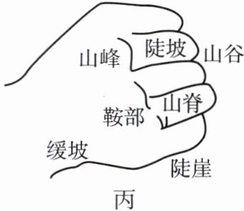 13. 为帮助学生理解知识点,王老师用紧握的拳头演示地形部位(如图丙)。如果在拳头上方(山峰)模拟降水,最终雨水汇集的地形部位名称是( )