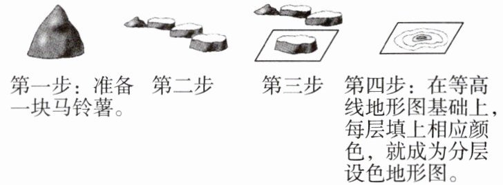 等高线地形图是地理学习中常用的“工具”。小明在老师指导下尝试用马铃薯制作了等高线地形图,并进一步画出了分层设色地形图,活动步骤如下图所示。读图,完成 10~11 题。