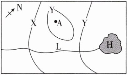 16. 如图为某地等高线地形图(局部),图中 X、Y 为等高线(等高距为 100 米),X 海拔 500 米,L 为河流,H 为湖泊。关于图中信息的判断,正确的是( )