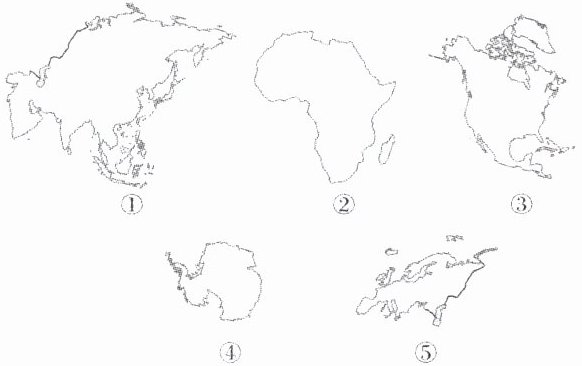 世界的大洲中,有的“肩并肩”完全连在一起,有的“冬季海峡铺冰桥”,成为相互连接的捷径,有的“手拉手”有运河连……读下面五个大洲的轮廓图,完成8~9题。