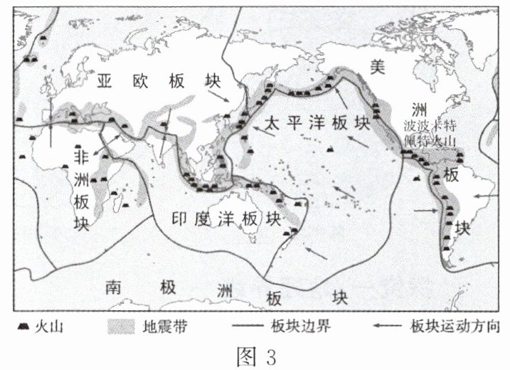 (4)图3为世界主要火山分布图,结合该图,用板块知识解释“波波卡特佩特火山是世界上最活跃的火山之一”。(4分)