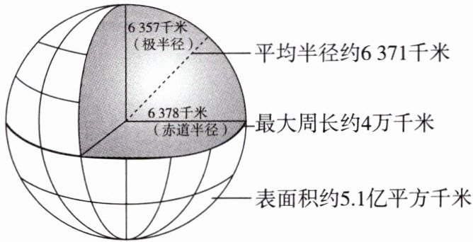 (4)地球的平均半径约为6 371千米;地球表面积约为5.1亿平方千米;地球赤道周长约为4万千米(任答两条)