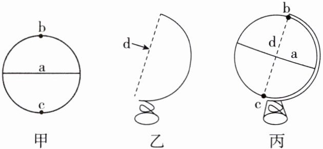 第三步:如丙图所示,在乒乓球 b、c 两处各钻一个小孔,将 d 从乒乓球小孔中穿过,然后在 d 的末端用胶布裹几圈,这样可以将乒乓球固定在 d 的中间,同时乒乓球又可以转动。
