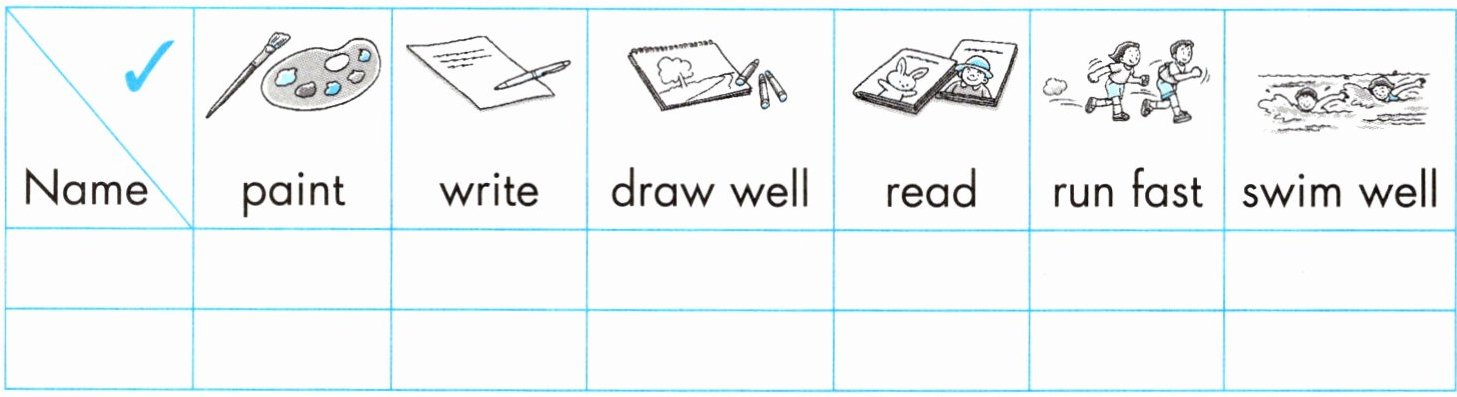 D Tick, ask and answer(勾一勾,完成下面的表格,然后根据提示与同学互相问答)